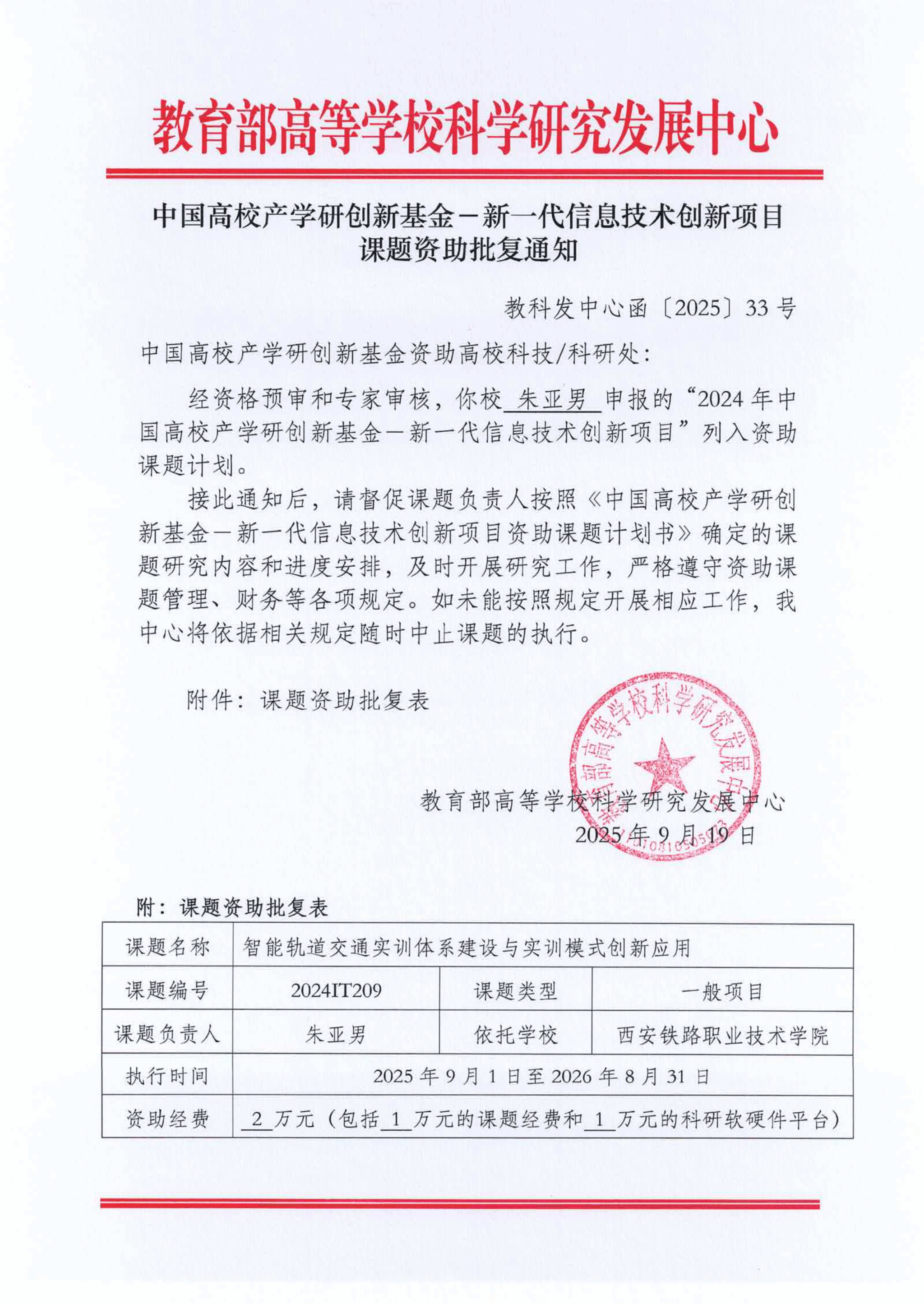 近日,教育部高等学校科学研究发展中心正式下发《中国高校产学研创新基金——新一代信息技术创新项目课题资助批复通知》(教科发中心函[2025]33号),西安铁路职业技术学院副教授朱亚男主持申报的“智能轨道交通实训体系建设与实训模式创新应用”课题(课题编号:2024IT209)成功获批立项,课题类型为一般项目,将获得2万元经费资助(含1万元课题经费与1万元科研软硬件平台支持),研究周期为2025年9月1日至2026年8月31日。