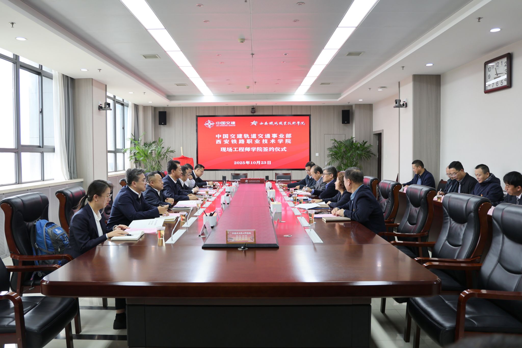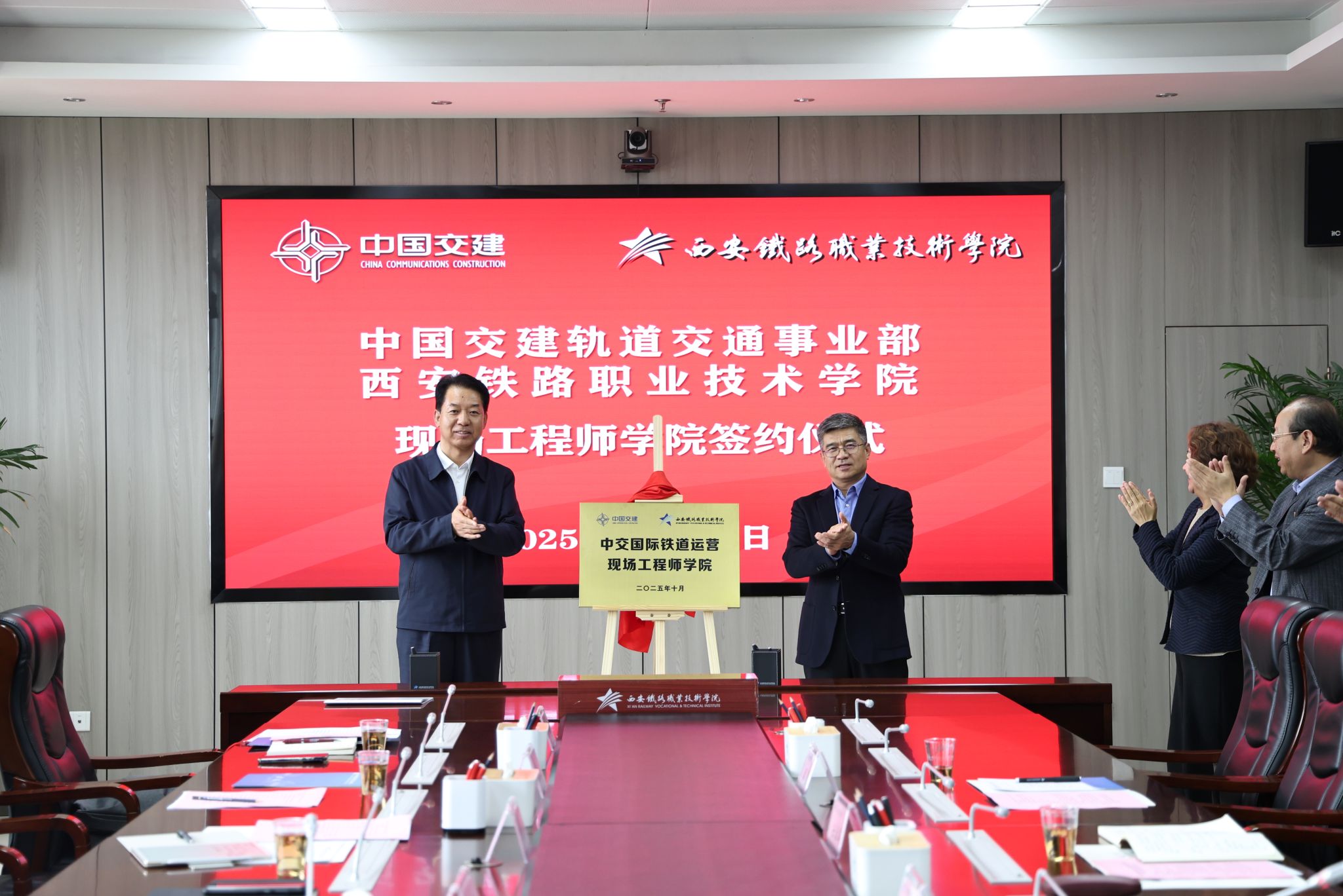2025年10月23日,西安铁路职业技术学院(以下简称“西铁院”)与中交国际铁道运营有限公司共建的“中交国际铁道运营现场工程师学院”正式揭牌成立。中国交建轨道交通事业部总经理、轨道交通分公司党委书记、董事长安爱军,中交国际铁道运营有限公司董事长王大海、总经理刘峻峰等一行,与西铁院党委书记赵春平、院长陈红等双方代表共同出席签约暨揭牌仪式,标志着校企双方在深化产教融合、共育高素质技术技能人才方面迈出战略性、实质性一步。
