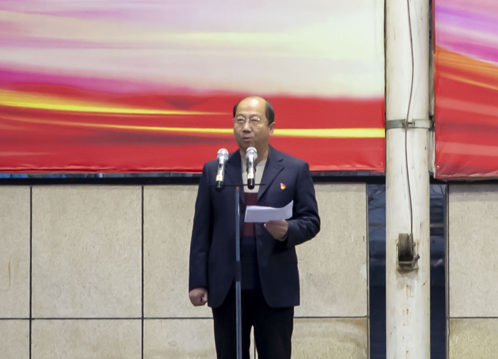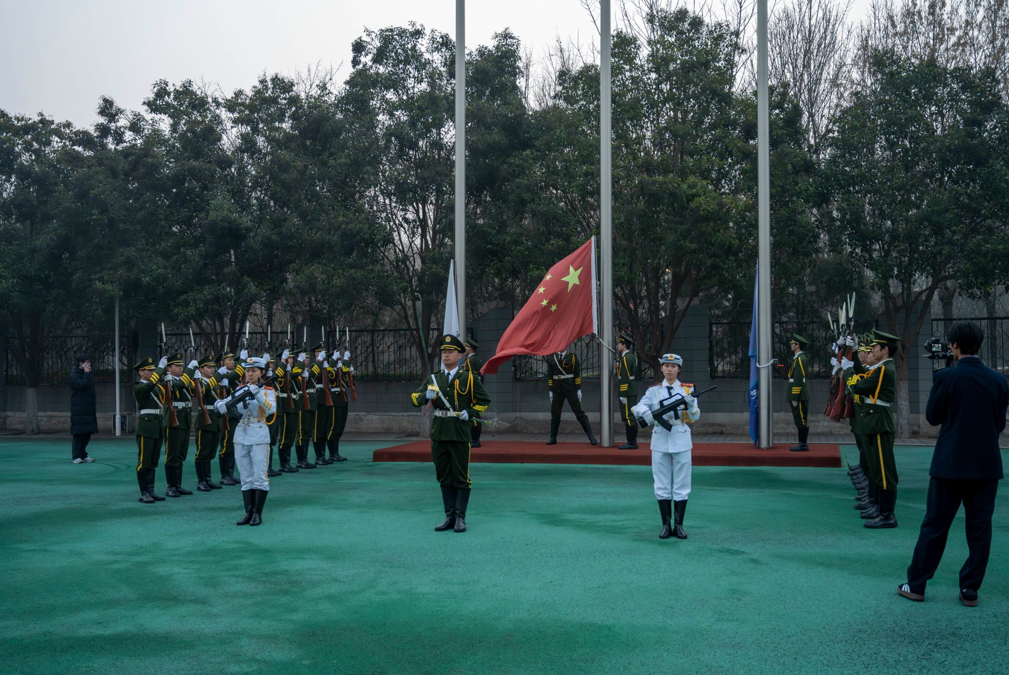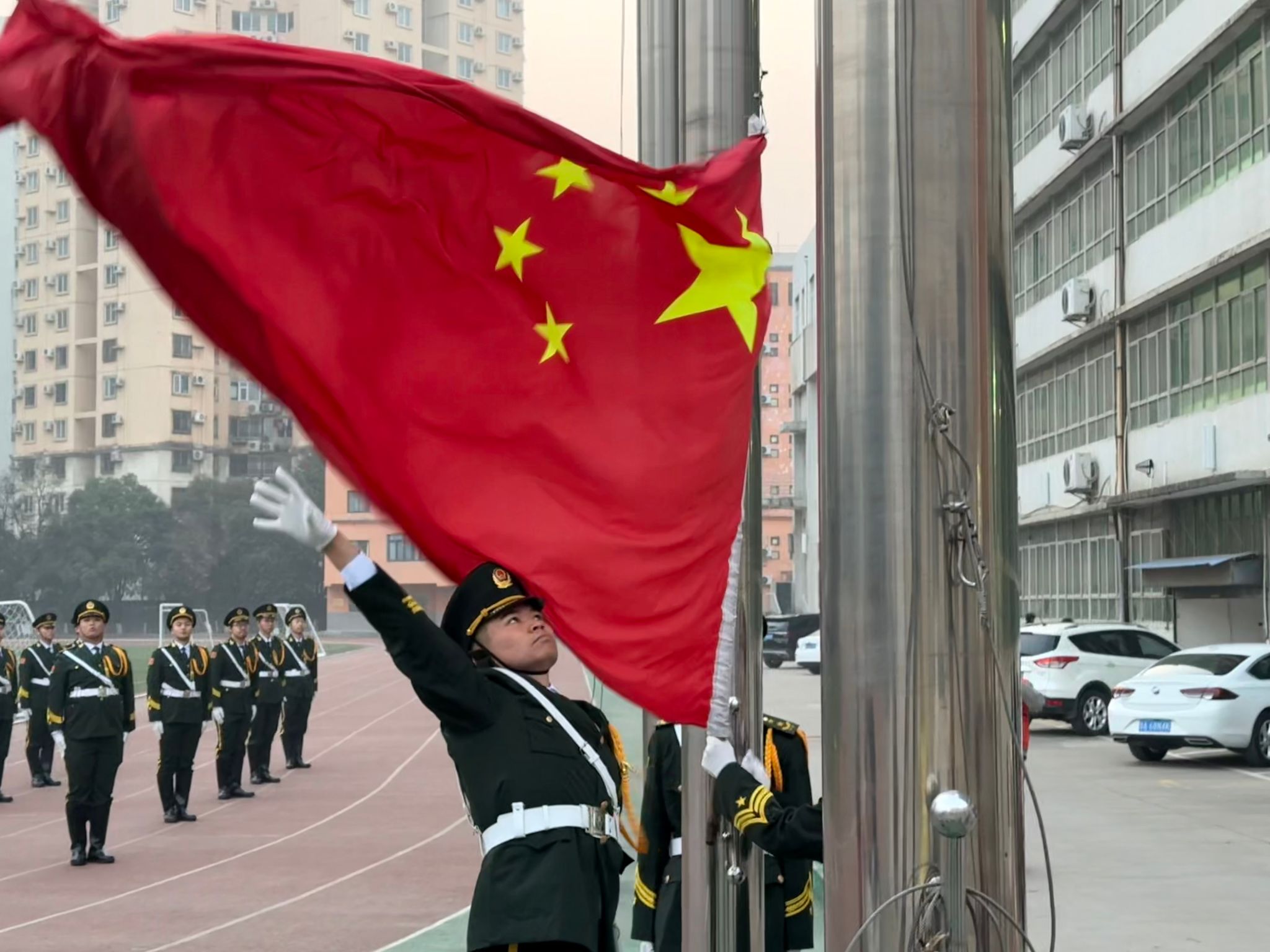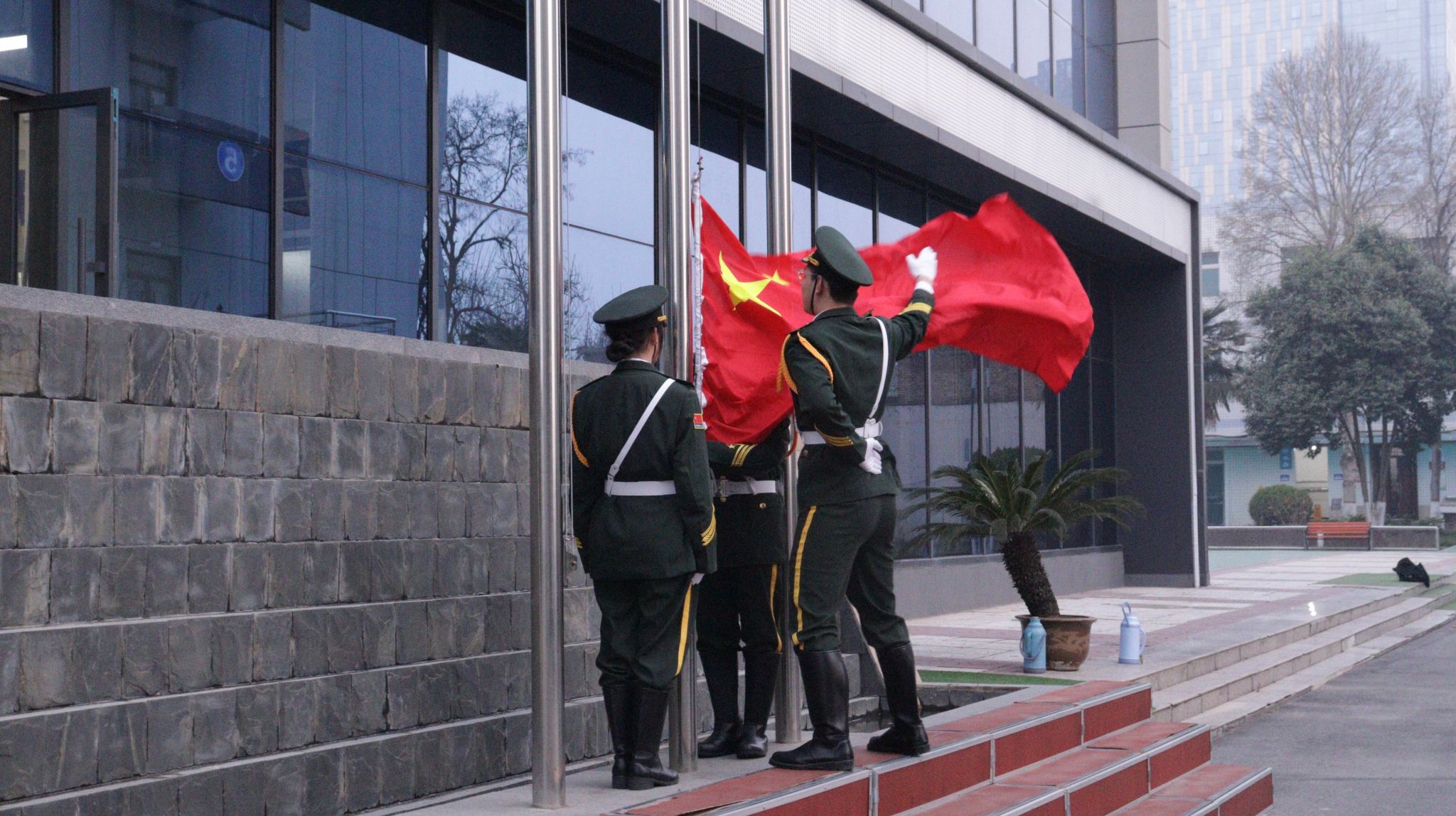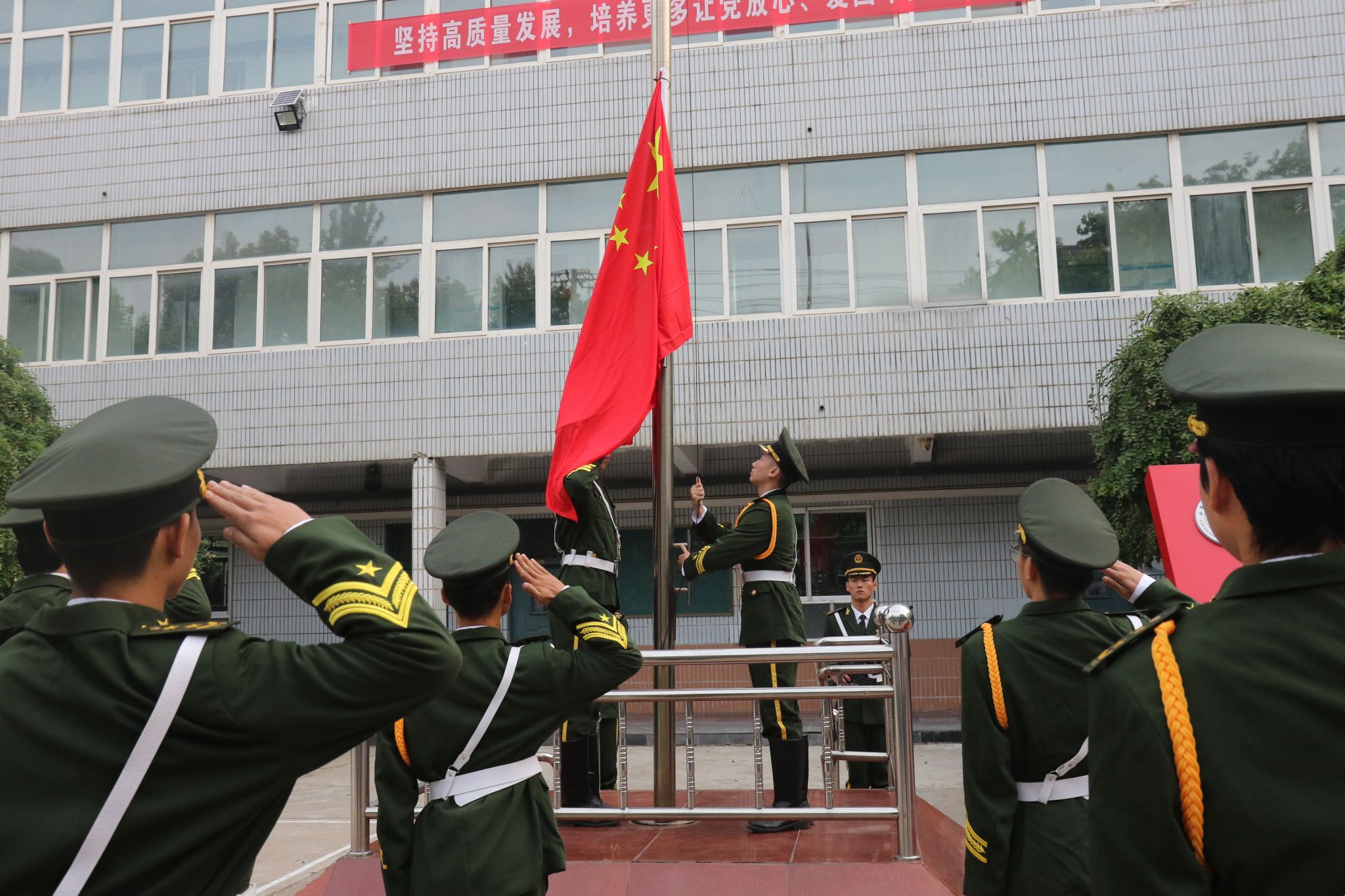 上午7时仪式正式开始,国旗护卫队整齐出旗。在庄严的国歌声中,鲜艳的五星红旗迎着朝霞冉冉升起,随后院旗也在院歌声中飘扬。