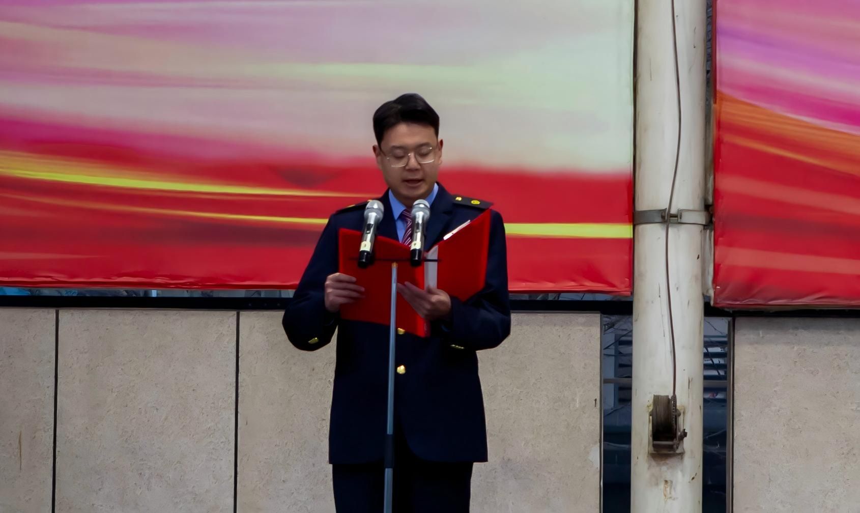 升旗仪式后,机电工程学院铁道车辆技术2402班学生郭涛作为学生代表进行了国旗下演讲。他结合自身作为红色讲解员的经历,分享了对“人民铁路为人民”初心的感悟。面对“十五五”规划开局之年与“新质生产力”的时代浪潮,他呼吁同学们将个人志向融入国家发展,努力成为掌握创新思维与数字化素养的新时代铁路工匠。他倡导大家做信念坚定的爱国者、锐意进取的实干家和甘于奉献的追梦人,为“交通强国”战略贡献力量。