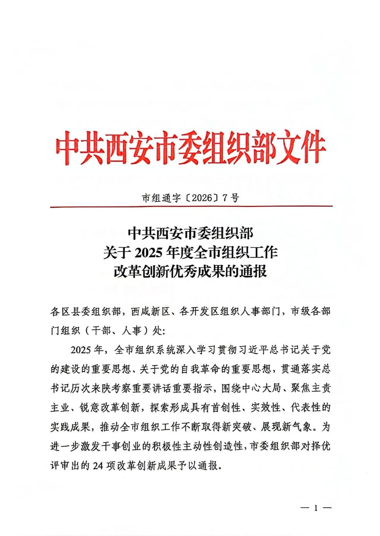 近日,西安市委组织部发布了《关于2025年度全市组织工作改革创新优秀成果的通报》(市组通字〔2026〕7号),我院申报的《“四维融合”打造职业教育“样板支部”》项目获得“2025年度全市组织工作改革创新项目”一等奖。