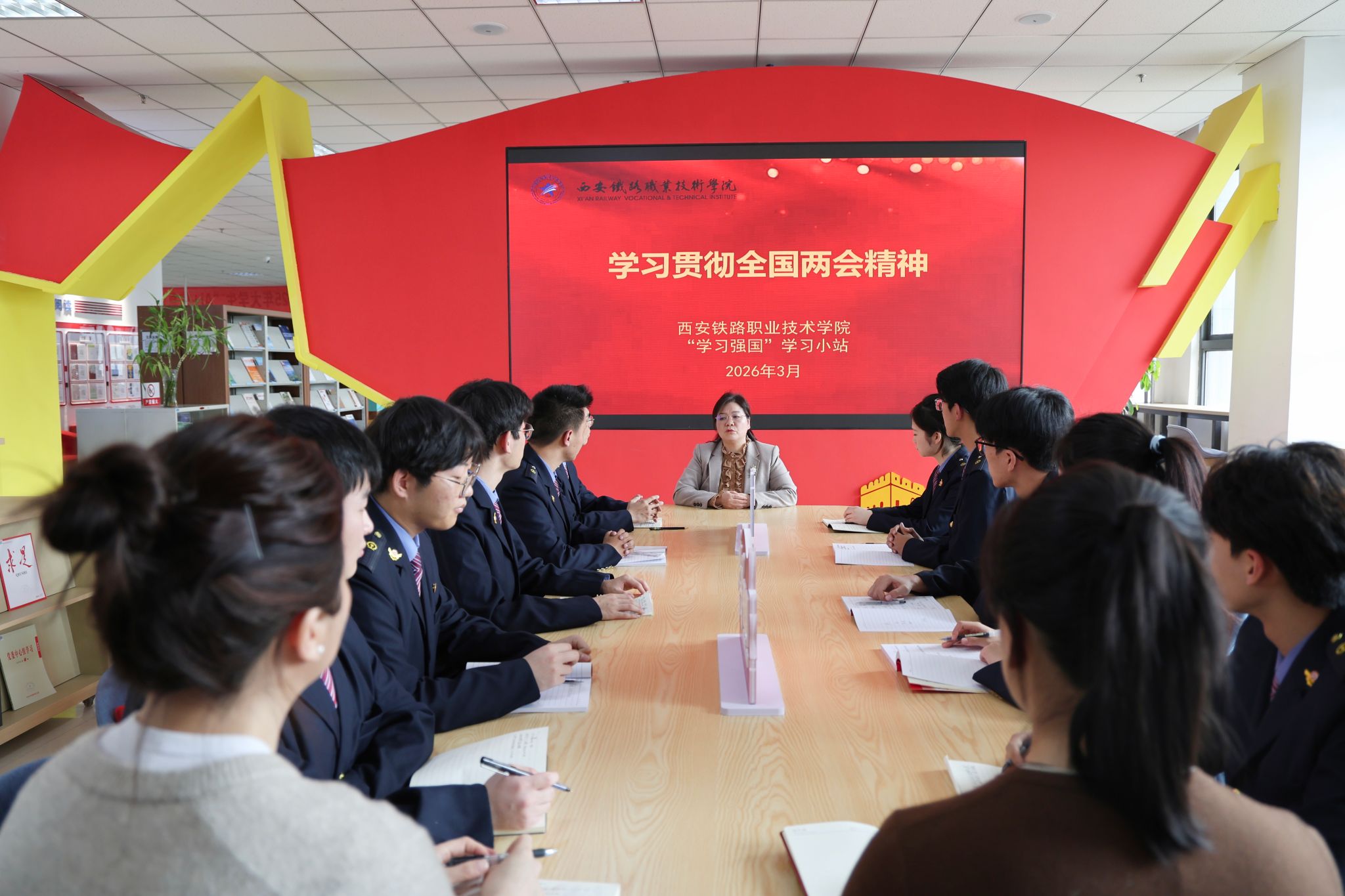报告会后,朱晓丽前往“学习强国”学习小站,与师生代表开展交流研讨。她围绕轨道交通行业绿色化改造、绿色技能储备等问题给予指导,并针对思政课青年教师的教学困惑,强调独立思考能力比AI工具更为重要,鼓励教师引导学生强化批判性思维和创新意识培养。师生们纷纷表示,将以此次报告为契机,深入学习贯彻全国两会精神,为推动学院事业高质量发展贡献力量。