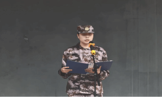 新生代表、五营二连学员、电子信息学院铁道通信2501班满伊同学发言,她代表全体新生郑重承诺,一要听从指挥,尊重教官,遵守军训纪律与规章制度。二要锤炼意志,不怕苦累,挑战自我,磨砺意志作风。三要团结互助,互帮互助,凝聚团队力量,展现良好风貌。四要巩固成果、将军训养成的好习惯带到学习和生活中。请领导、老师们、教官们放心,我们全体2025级新生,定当不辱使命,在西铁院这片沃土上,书写属于我们的铁色青春。