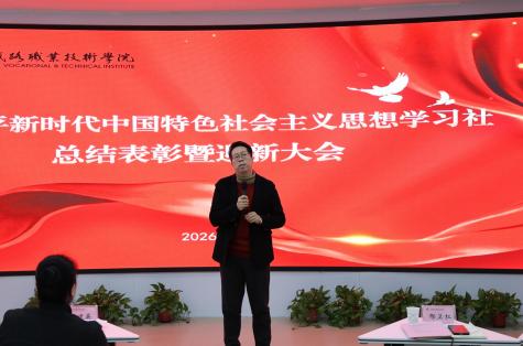 最后,邢卫红作总结讲话,他充分肯定“新时代学习社 ” 2025 年度的工作成效,并向优秀学员和新社员表示祝贺与欢迎。他强调,“新时代学习社 ”是深化理论学习、筑牢理想信念的重要平台,全体学员在过去一年积极学习与实践,展现出西铁院青 年的思想觉悟与担当。他希望大家持续深化理论武装,坚持学用 结合,立足铁路专业特色,将学习成果转化为专业能力,将个人成长融入国家发展,在新时代展现新作为。