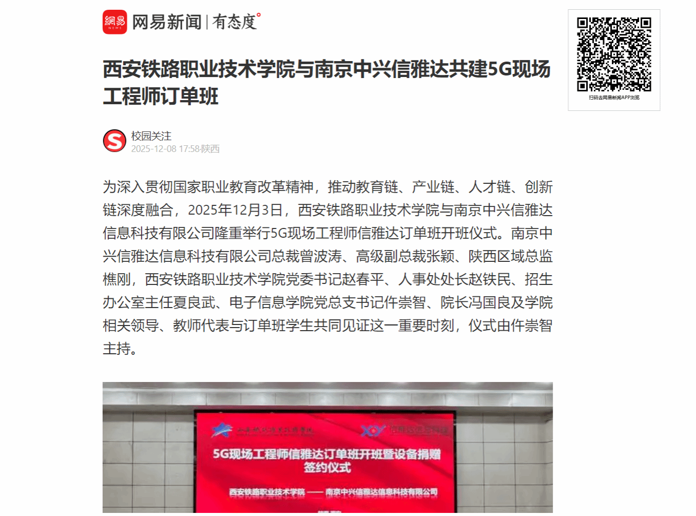 西安铁路职业技术学院与南京中兴信雅达共建5G现场工程师订单班